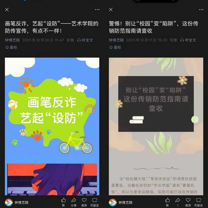 学院充分发挥新媒体传播优势,通过微信公众号定期推送防范传销主题内容。推文涵盖传销案例解析、知识科普、骗局揭秘、学生心得体会等,采用网络流行语、图文漫画、短视频等学生喜闻乐见的形式,让专业的防范知识变得通俗易懂。其中,Q 版传销套路漫画、5 分钟防传短剧等创意内容,以生动形象的方式戳破传销骗局,让反诈知识 “活” 起来,不仅覆盖全院师生,更吸引了学生家长和社会人士的关注,显著提升了宣传传播效率。