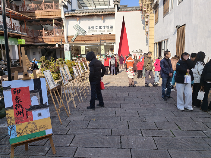 展览现场,学子志愿者化身文化使者,为驻足观众细致讲解创作背景、艺术构思与地域文化内涵,引导大家在笔墨光影中读懂徽州、爱上传统。此次展览突破传统美术馆的边界限制,将艺术空间延伸至屯溪河街这一承载徽州文脉与市井烟火的公共场景,让专业艺术走出象牙塔、走进大众生活。