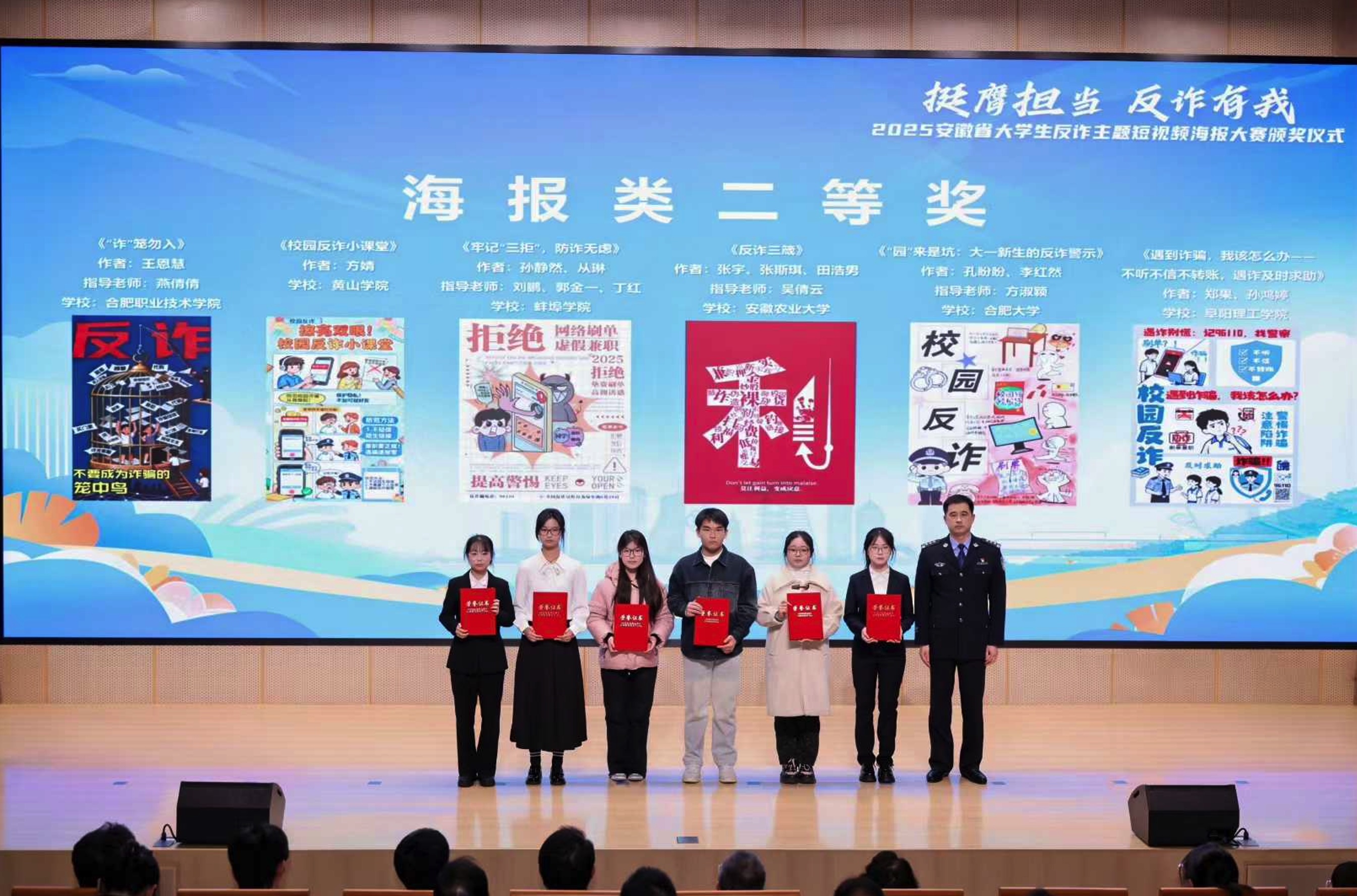 1月9日下午,由安徽省通信管理局、安徽省公安厅、安徽省教育厅、共青团安徽省委员会、安徽省学生联合会共同主办的2025年安徽省大学生反诈主题短视频海报大赛颁奖仪式在安徽医科大学圆满落幕。艺术学院25视传1班学生方婧创作的海报作品《校园反诈小课堂》在众多参赛作品中脱颖而出,荣获大赛二等奖。