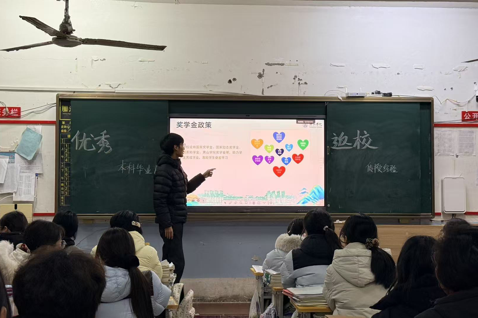 近日,艺术学院学生第三党支部组织学生党员、入党积极分子利用寒假返乡契机,开展了“2026年寒假回高中母校招生宣传”社会实践活动。支部成员化身“校园宣讲大使”,分赴各地生源高中,用亲身经历讲述在黄山学院的成长点滴。