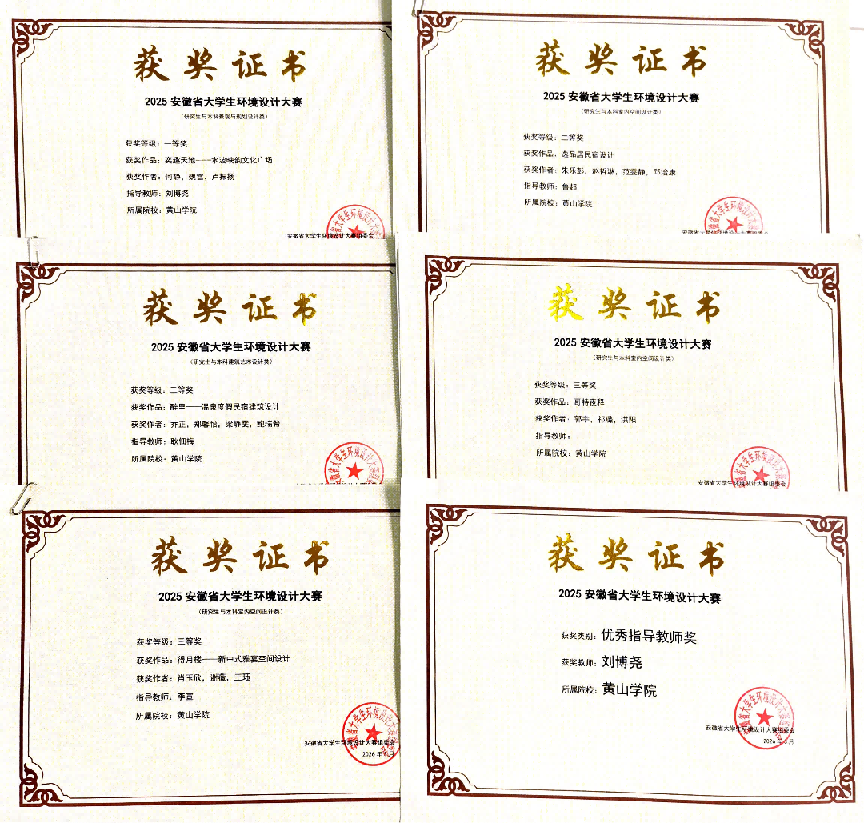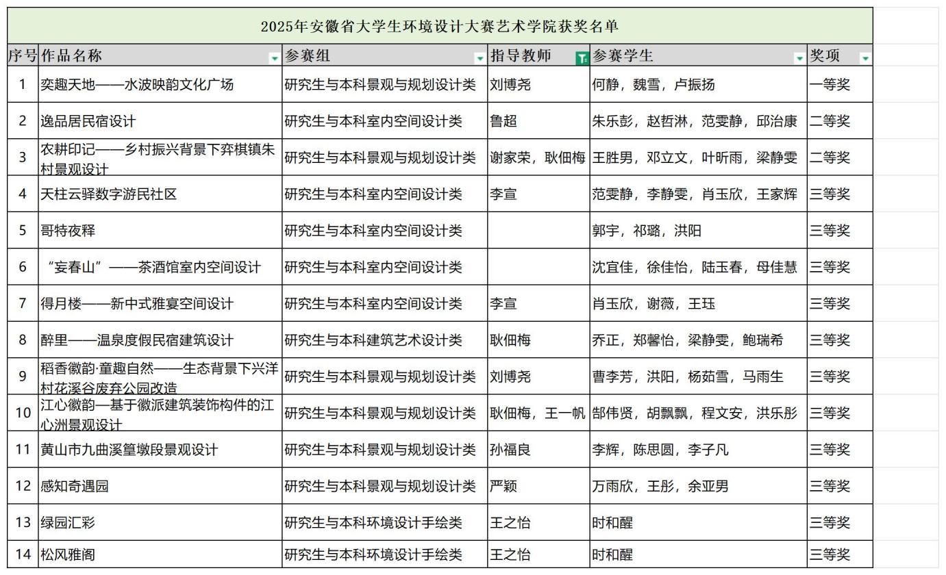 近日,由安徽省教育厅主办,安徽工程大学承办的“2025年安徽省大学生环境设计大赛”获奖名单公布,艺术学院学子在赛事中荣获14个奖项,其中一等奖1项、二等奖2项、 三等奖11项,刘博尧获优秀指导教师奖。