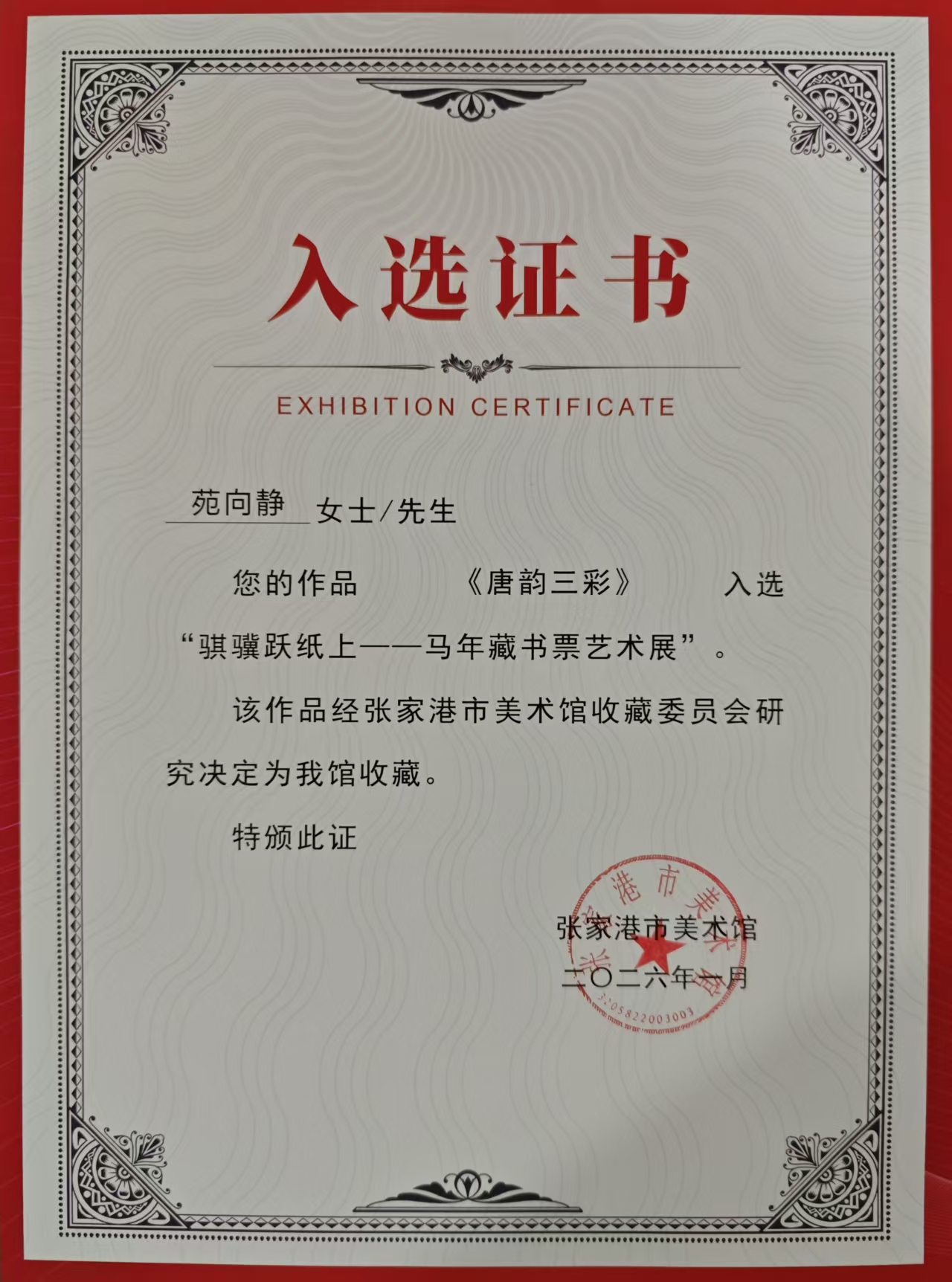 2026年3月16日,从张家港市美术馆传来喜讯,我院23级工艺美术专业苑向静同学的水印木刻版画《唐韵三彩》入选展览并被收藏。