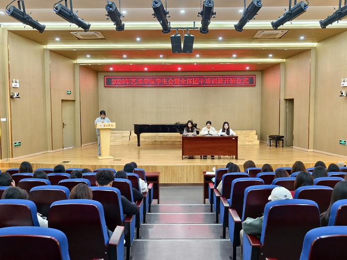 近日,2026年艺术学院春季学生会暨全体团干培训班开班仪式在学院音乐厅举行。学院团委副书记许姣,学生兼职副书记金雅蓉,以及学生会全体干事、各班级团支部代表参会,学生会主席康钧棋主持本次仪式。