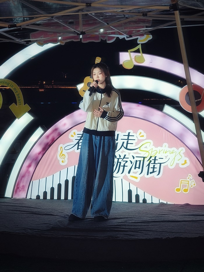 流行歌曲演唱会环节,参演学子涵盖音乐学、新闻学等专业及校园歌手大赛获奖选手,演唱曲目兼顾经典与流行,学子们以真挚的情感、娴熟的演绎,展现了良好的艺术感知力与美育浸润成效,为街区群众带来了一场高品质的音乐盛宴。